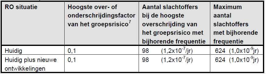 | Variant | Hoogste over- of onderschrijdingsfactor van het groepsrisico | Aantal slachtoffers bij de hoogste overschrijding van het groepsrisico met bijhorende frequentie | Maximum aantal slachtoffers met bijhorende frequentie |