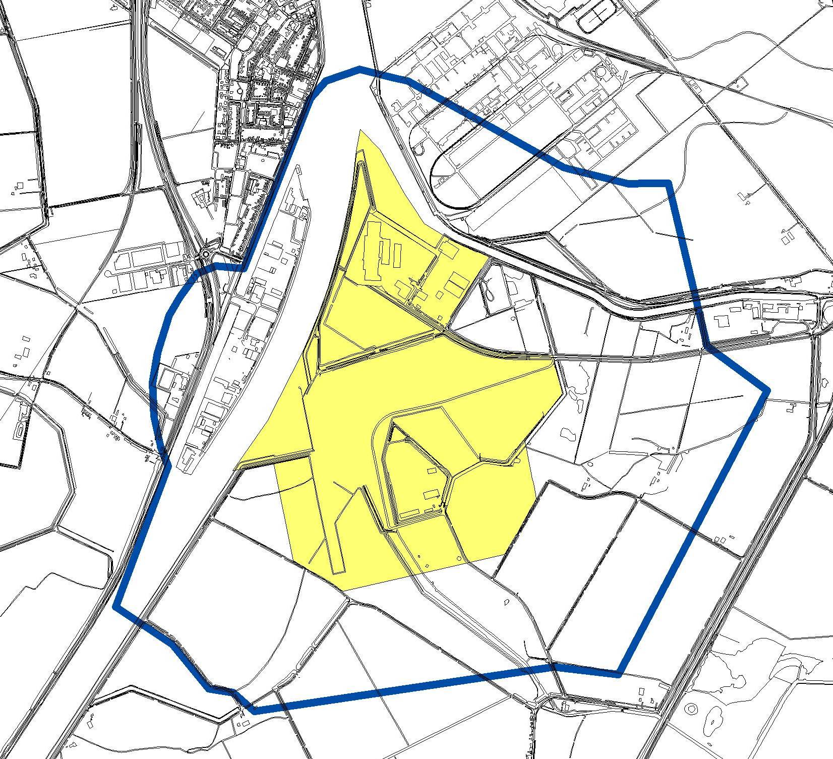 Figuur 4.6. Grens gezoneerd industrieterrein Axelse vlakte II (geel vlak) en bijbehorende geluidzone industrielawaai (blauwe lijn).
