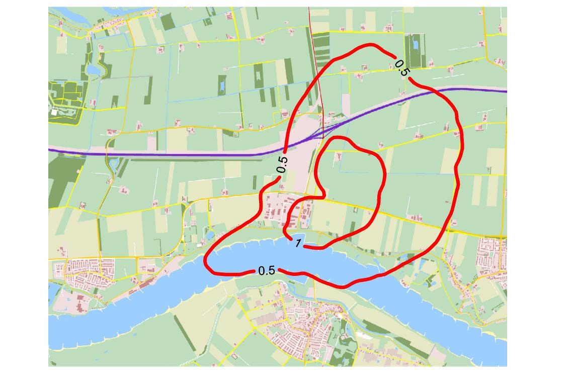 De 0,5 en de 1,5 OUE/ m3 als 98-percentiel contour (van buiten naar binnen)