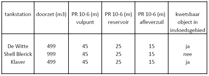 Hieruit blijkt dat er zowel bij Tankstation De Witte aan de Fort Sint Michielstraat / Eindhovenseweg als bij Autobedrijf Klaver aan de Pastoor Stassenstraat kwetsbare objecten binnen de contour zijn gelegen. De PR-contouren van deze tankstations zijn in dit bestemmingsplan opgenomen op de verbeelding en in de regels (artikel 34.2 veiligheidszone - lpg).