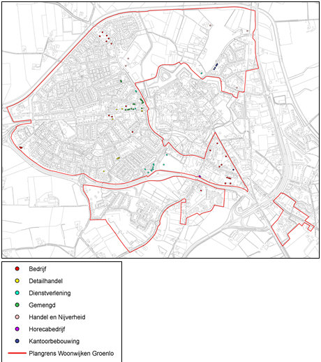 Huidige situatieIn de woonwijken van Groenlo komen zowel detailhandel, horeca, dienstverlening en bedrijven in het gebied voor. Over het algemeen kan worden gesteld dat de meeste niet-woonfuncties te vinden zijn in de oude linten, in de nabijheid van het centrum, dan wel aan de rand van de woonwijken.
