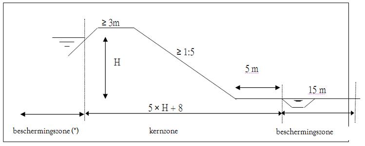 Figuur 3- Schematisch overzicht bij keurzone met dijksloot. (*) deze beschermingszone wordt niet als "waterstaatsdoeleinden" bestemd. Voor activiteiten in deze zone is keurvergunning vereist.