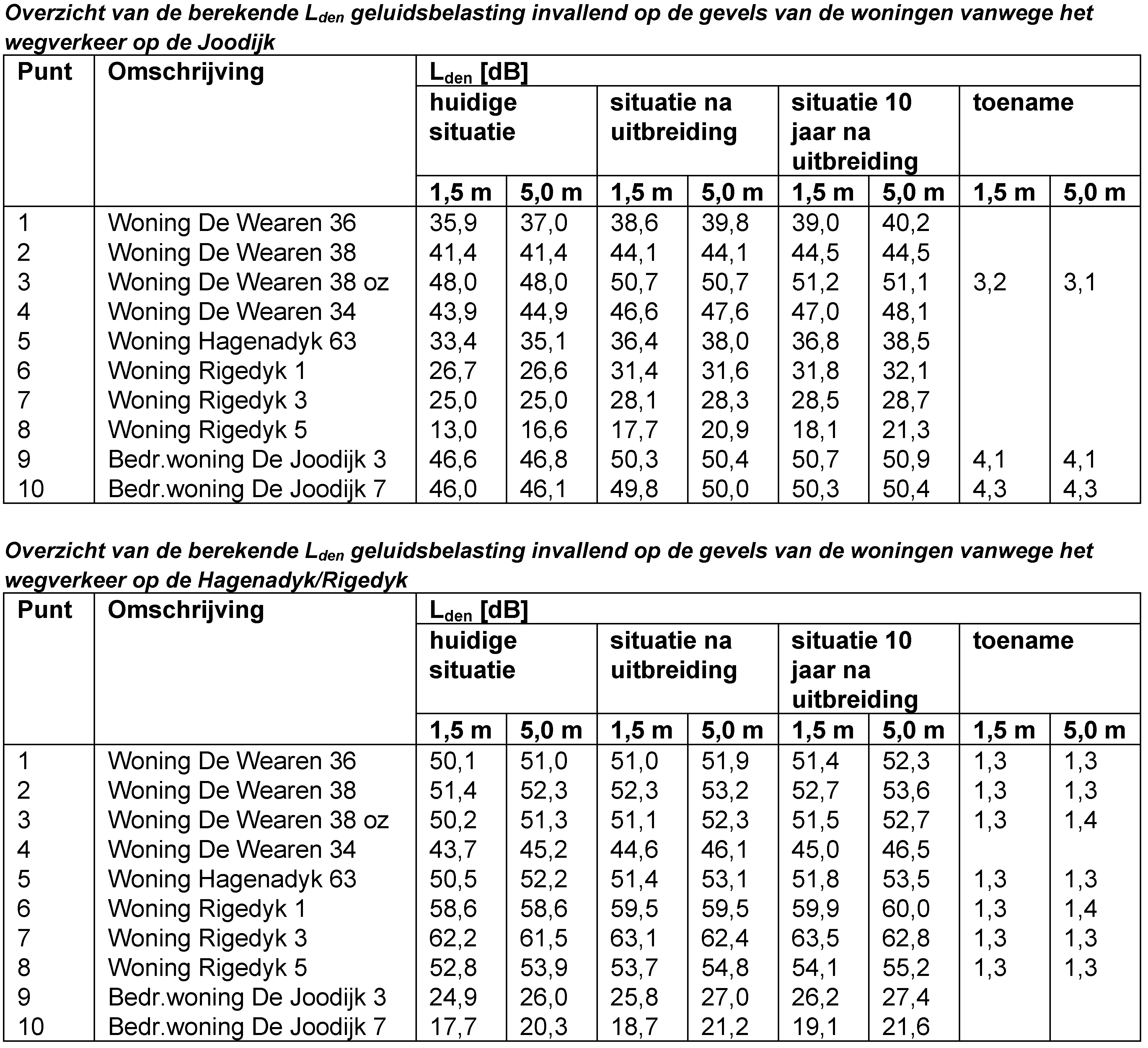 In onderstaande tabellen is een overzicht weergegeven van de berekende Lden geluidsbelasting vanwege het wegverkeer op De Joodyk en de Hagenadyk/Rigedyk invallend op de relevante woningen voor de huidige situatie (2011) de situatie na de geprojecteerde uitbreiding en de situatie 10 jaar na realisatie van de uitbreiding. In de waarden is de correctie van 2 dB of 5 dB op grond van artikel 110g van de Wet geluidhinder opgenomen. Daar waar de geluidsbelasting hoger is dan de voorkeursgrenswaarde van 48 dB is in de tabel tevens de toename van de geluidsbelasting aangegeven.